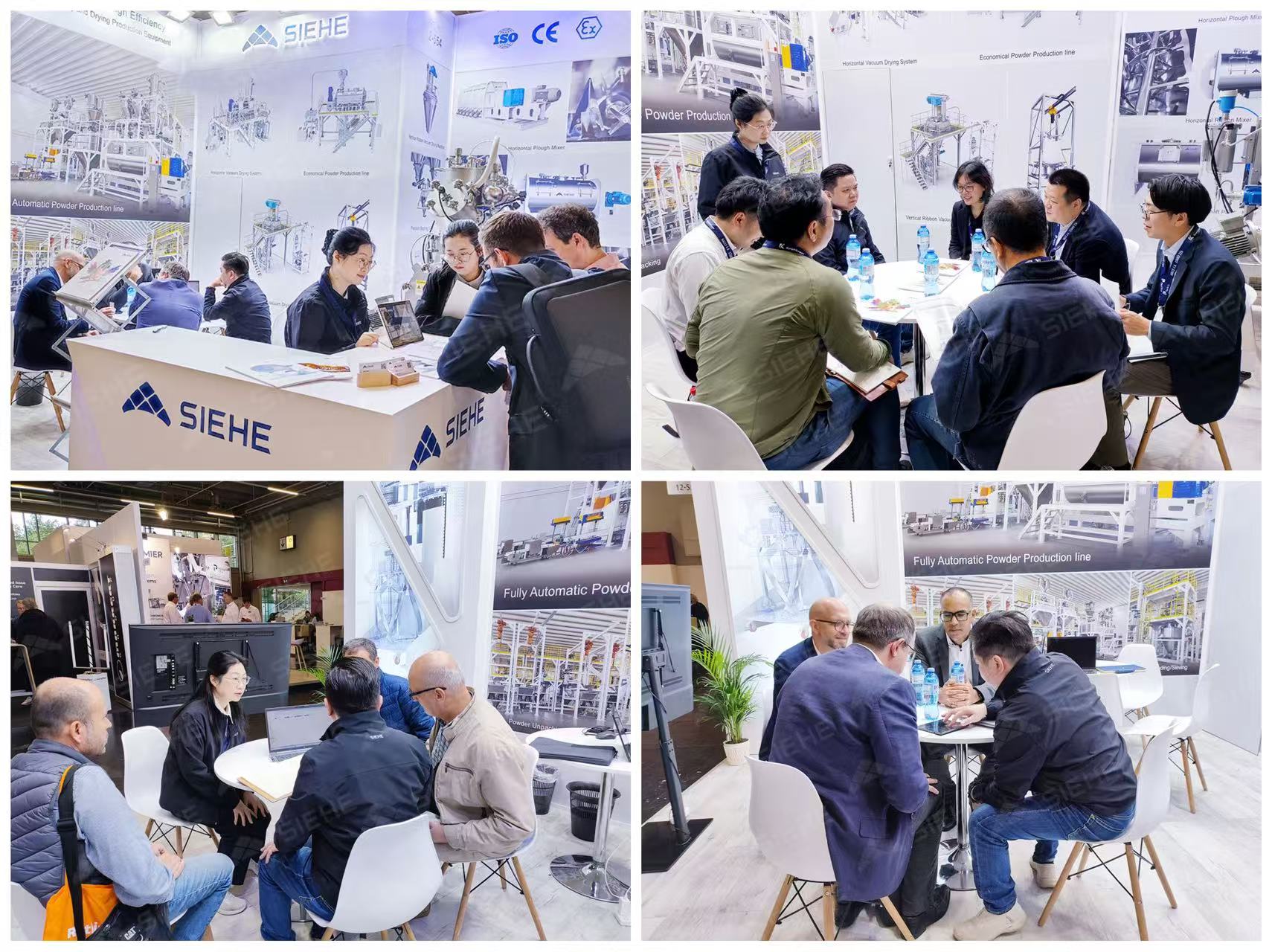 At the exhibition, SIEHE Group showcased its core equipment, including the Fully Automatic Powder Production Line, the Horizontal Vacuum Drying System, the Vertical Ribbon Vacuum Drying System, the Double Planetary Dispersing Mixer, and the Lab Horizontal Plough Vacuum Drying Mixer. These products demonstrated its systematic innovation across powder processing, drying, mixing, dispersion, and conveying.